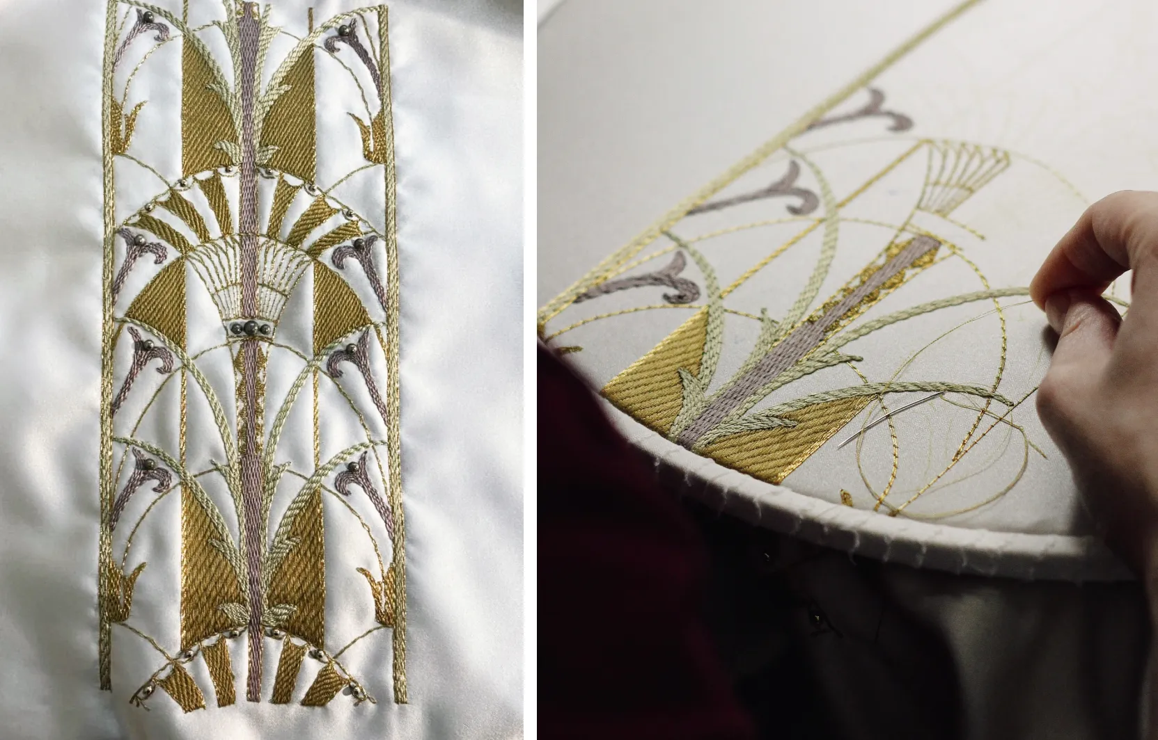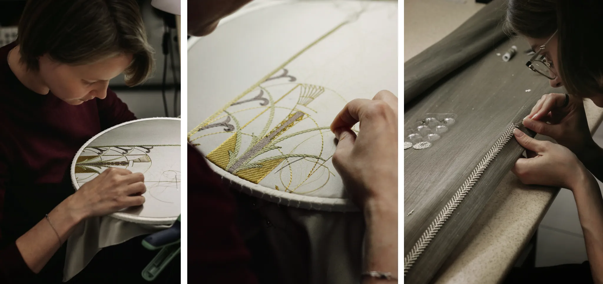 Работа требует идеально ровного натяжения ткани и абсолютной точности стежков.