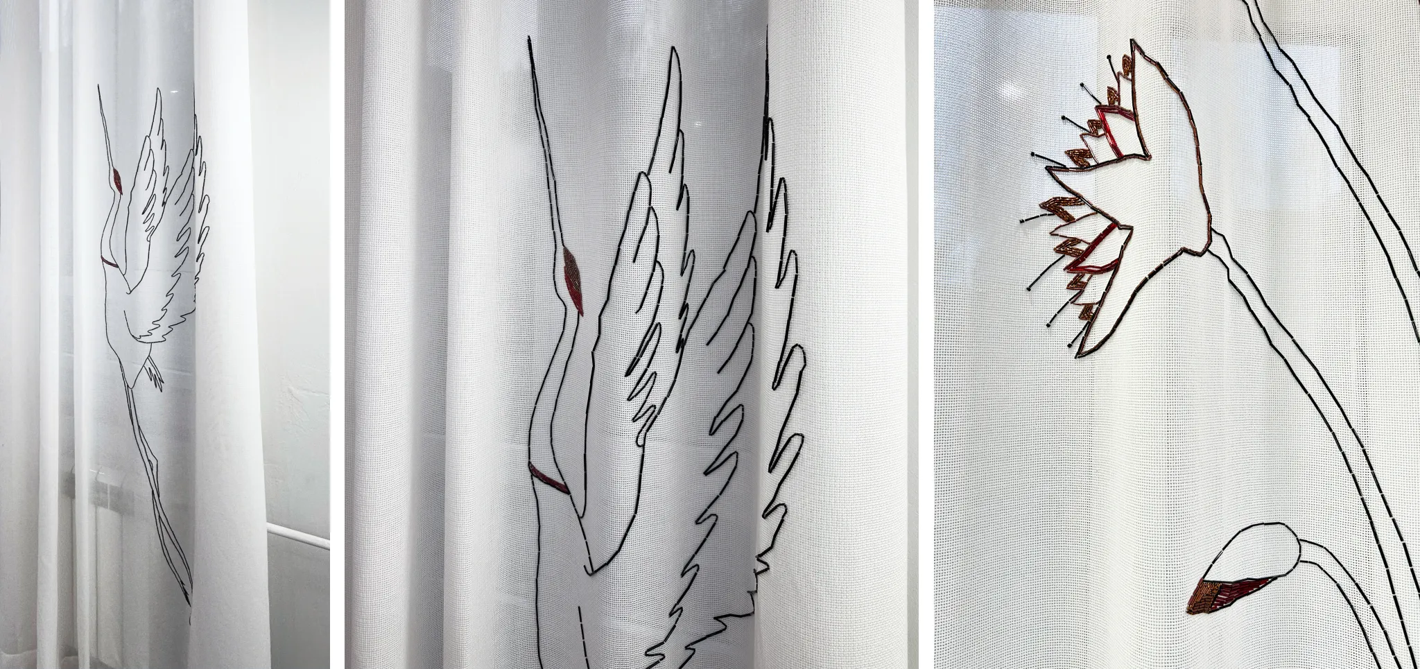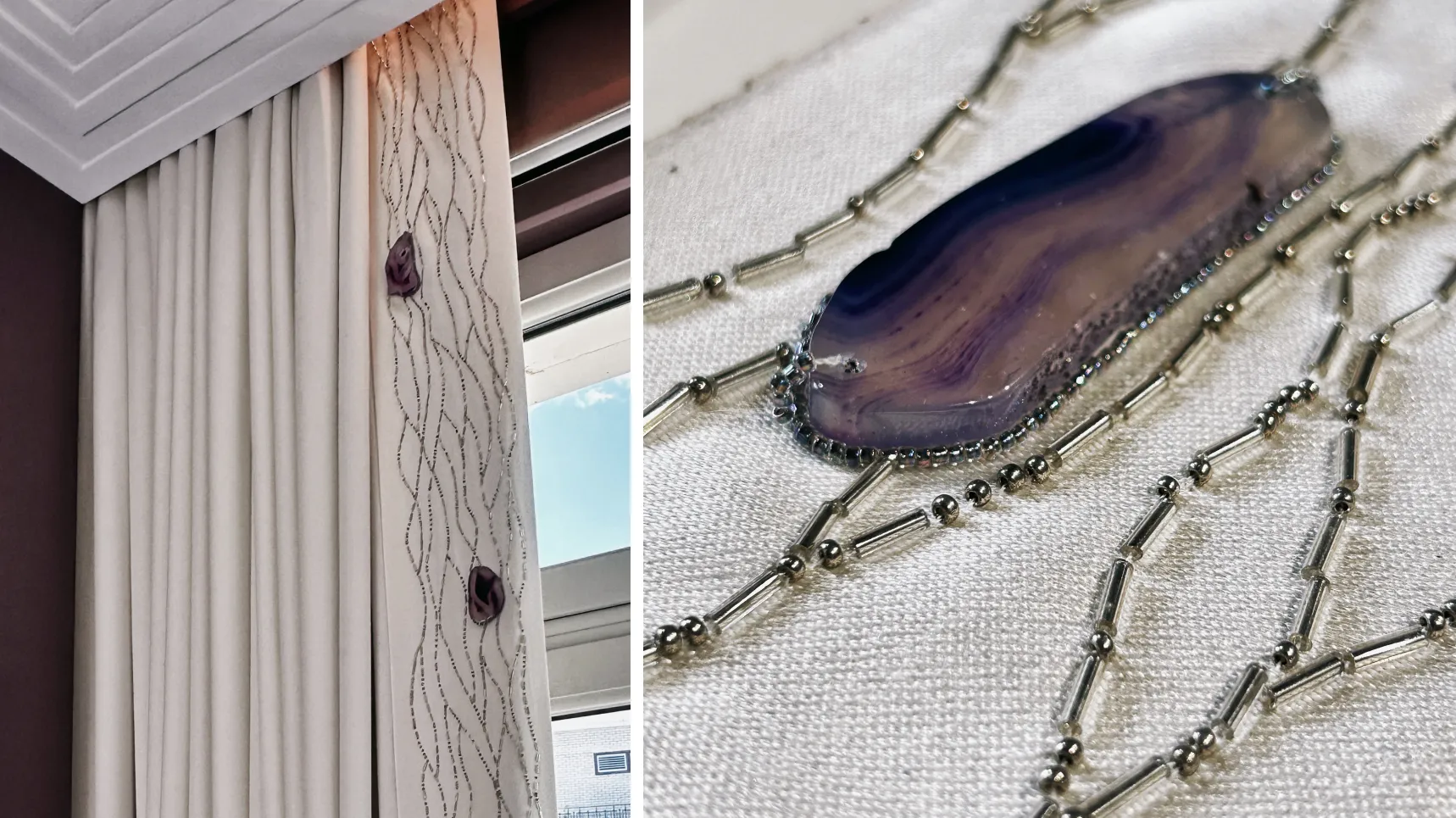 Особенности исполнения в Decortier: мастерицы используют разные типы камней и стекла, подбирая оттенки и размеры под конкретный проект. Такая вышивка требует высокой точности, так как применяется на полотнах разной площади — от деталей на декоративных подушках до отделки портьер и римских штор.