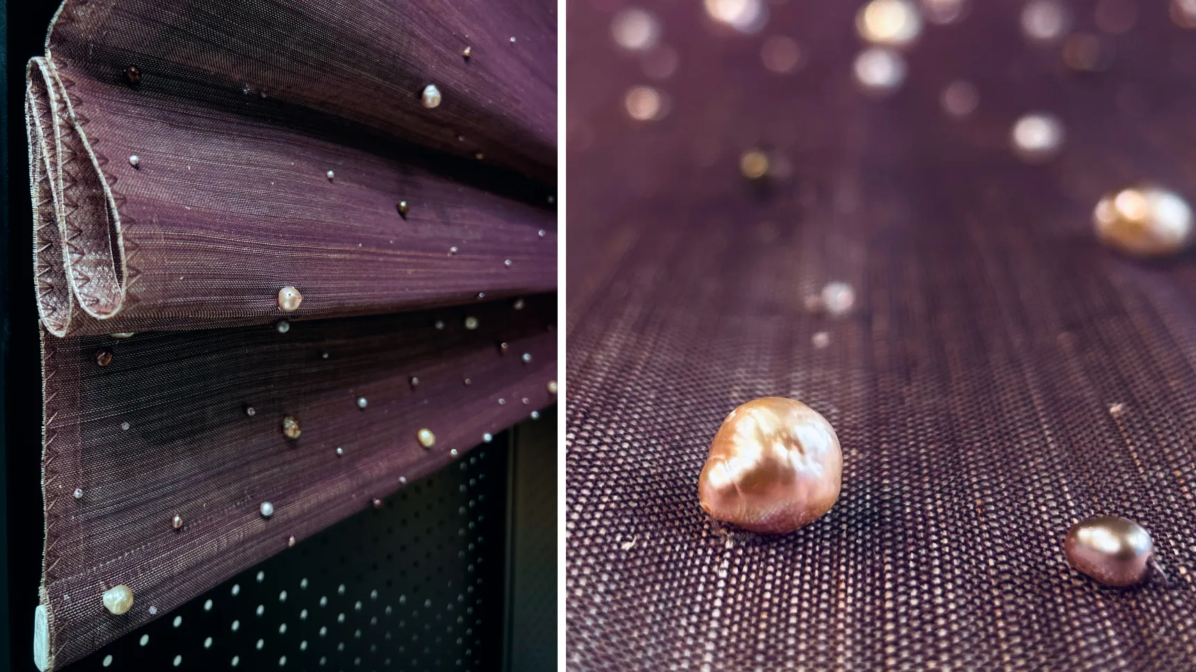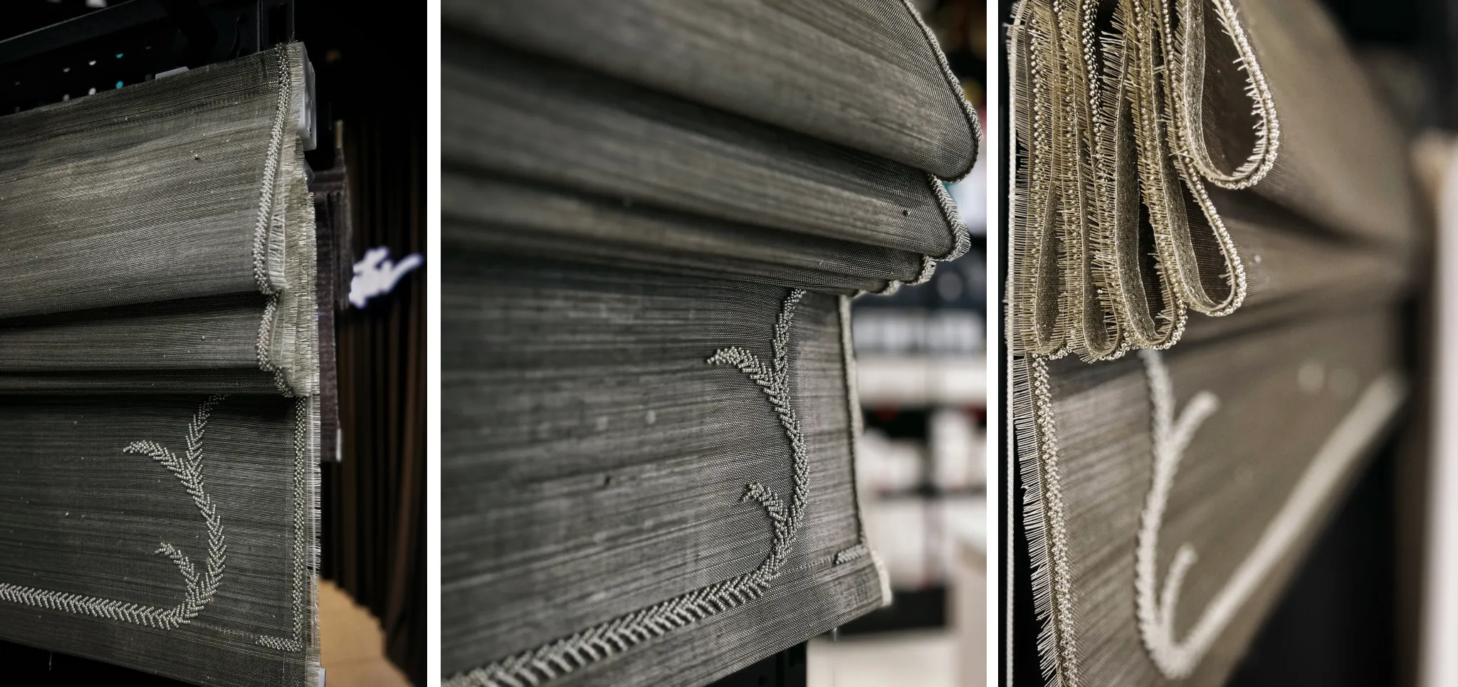 Вышивка жемчугом на римской шторе Decortier. Стоимость: от 50 000 ₽.