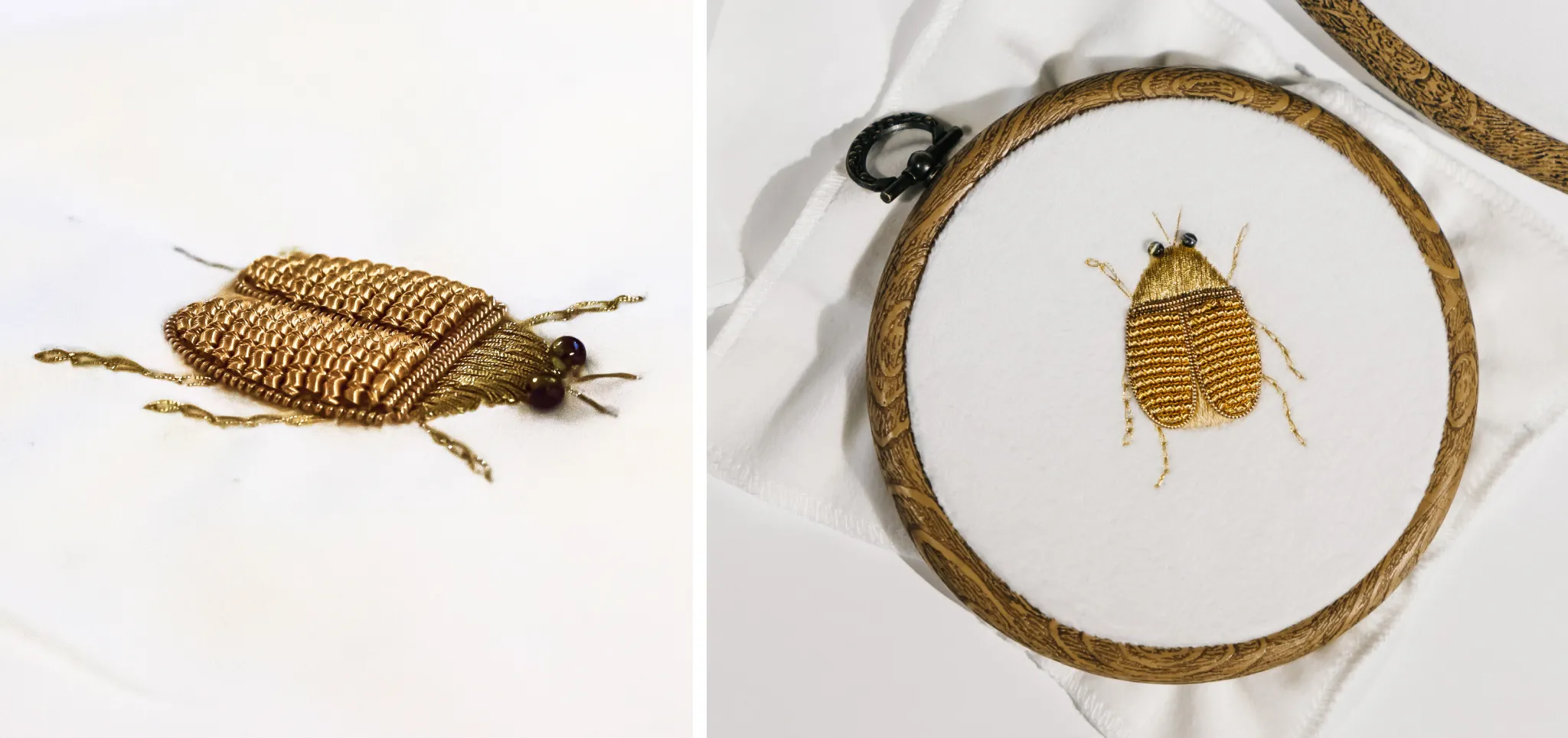Сочетание настила и канители двух типов формирует основу для миниатюр, где важны объём, направление нитей, многослойность и резкость контура. «Жук» — классический пример декоративной вышивки: компактный размер, много деталей, работа со сдержанным, при этом изысканным блеском.