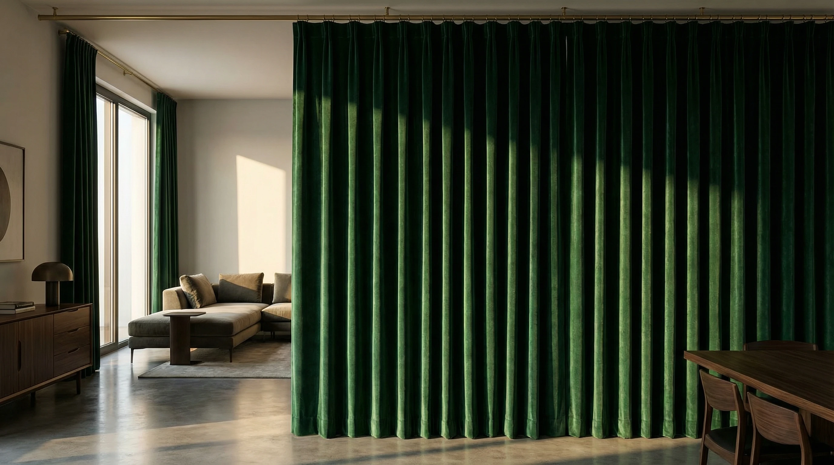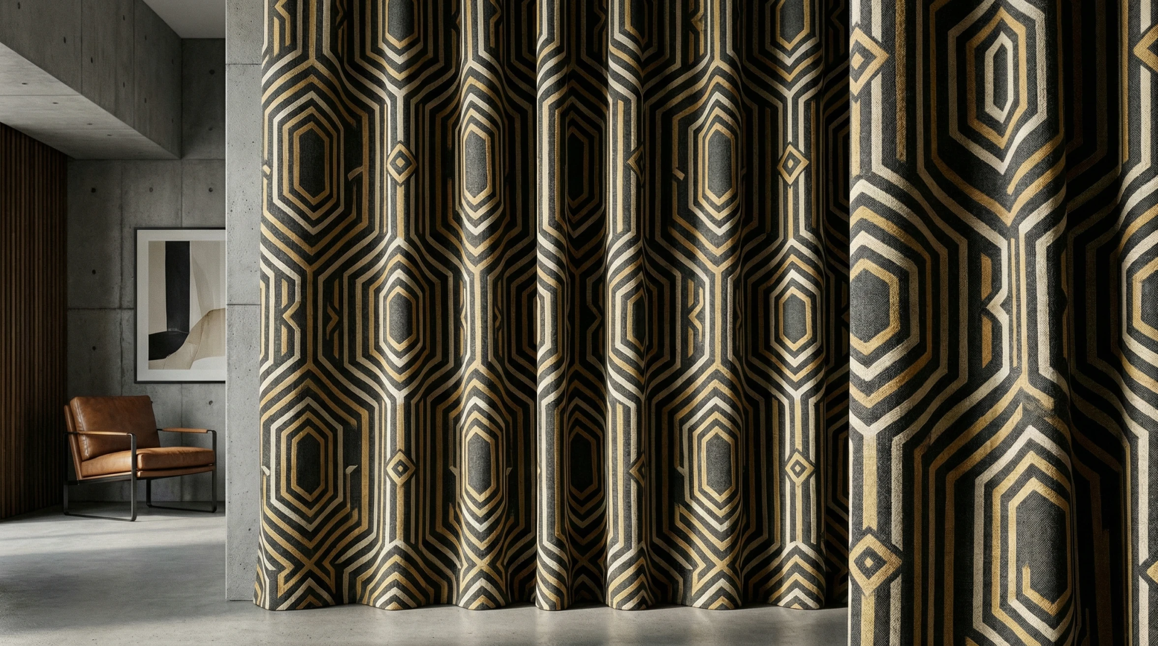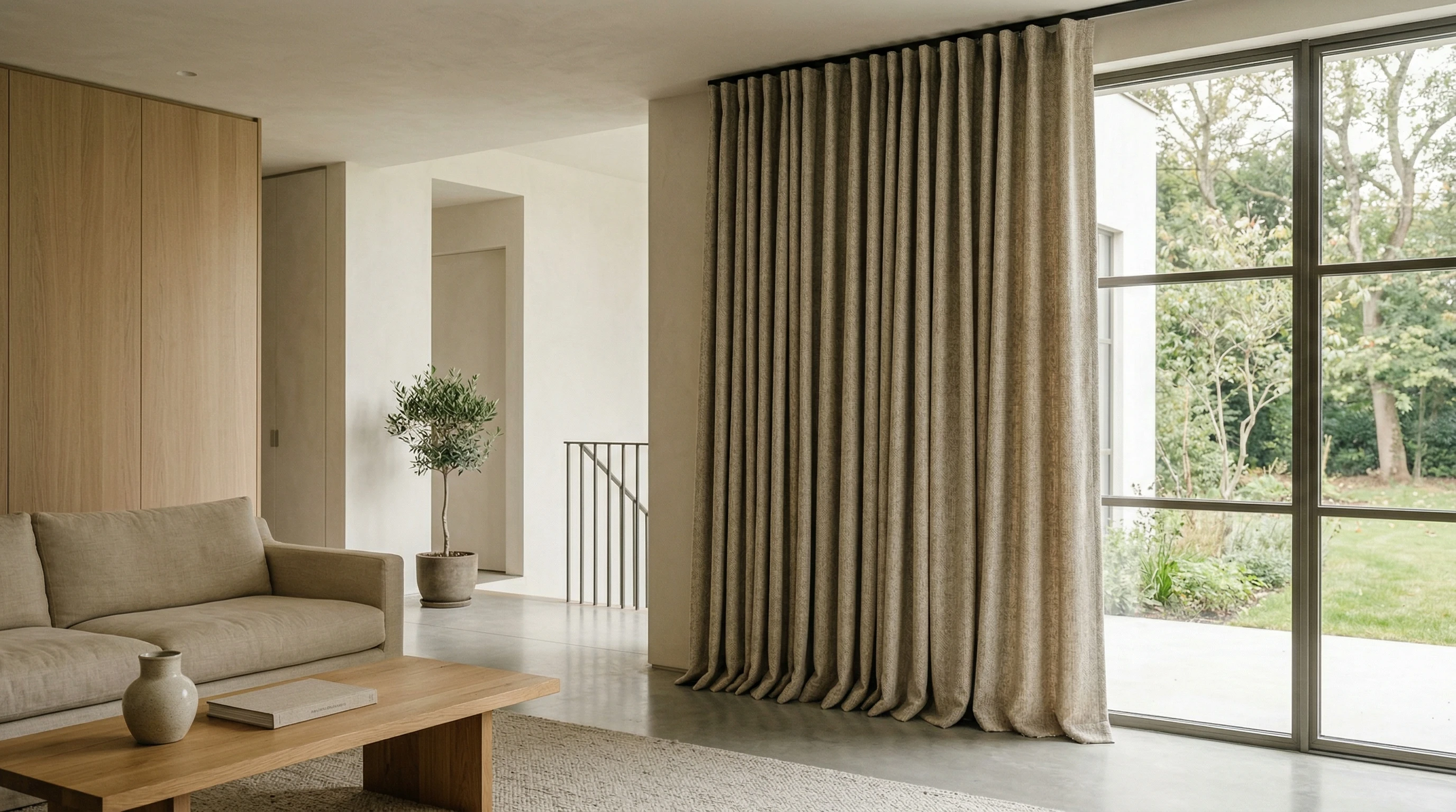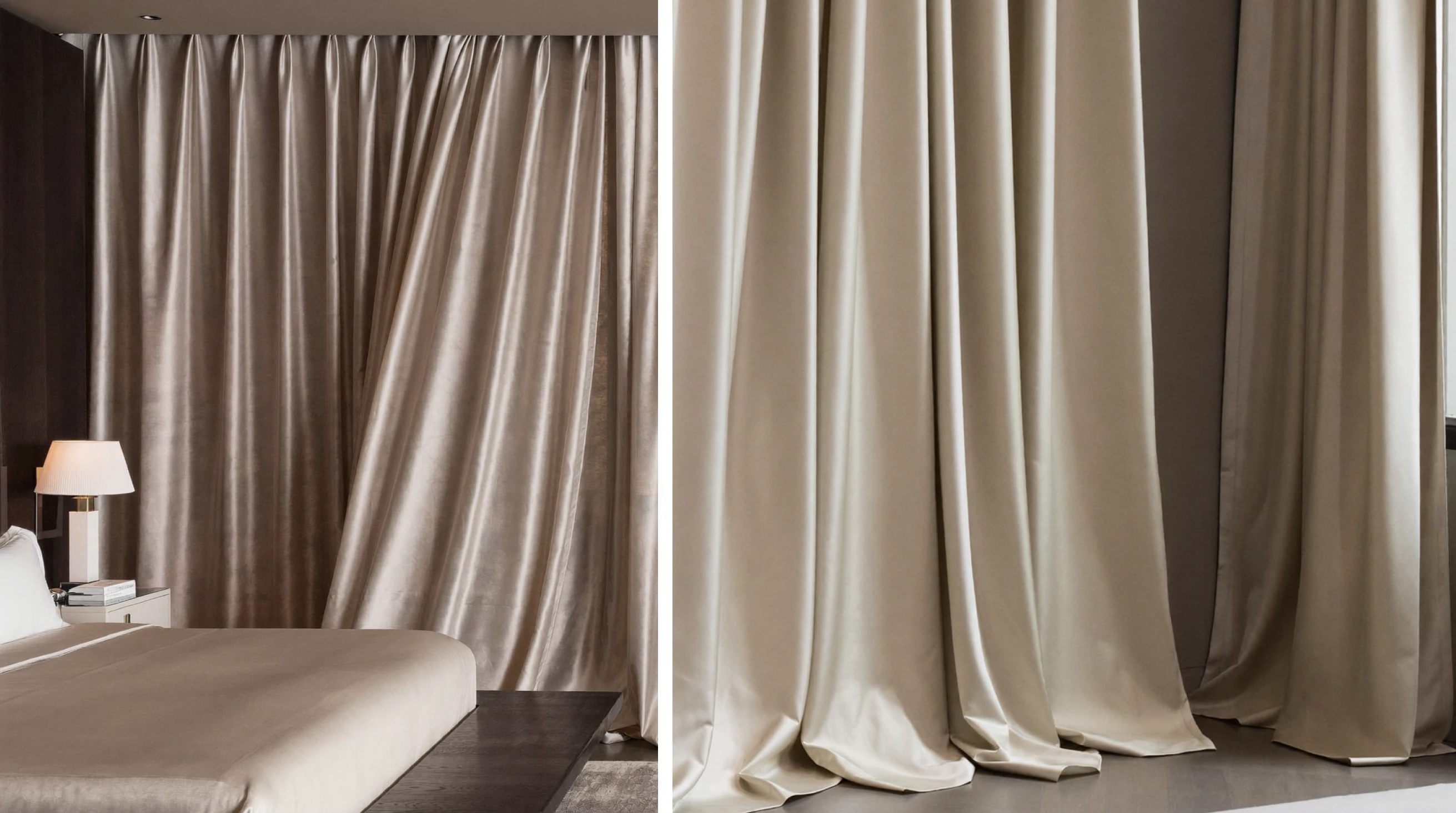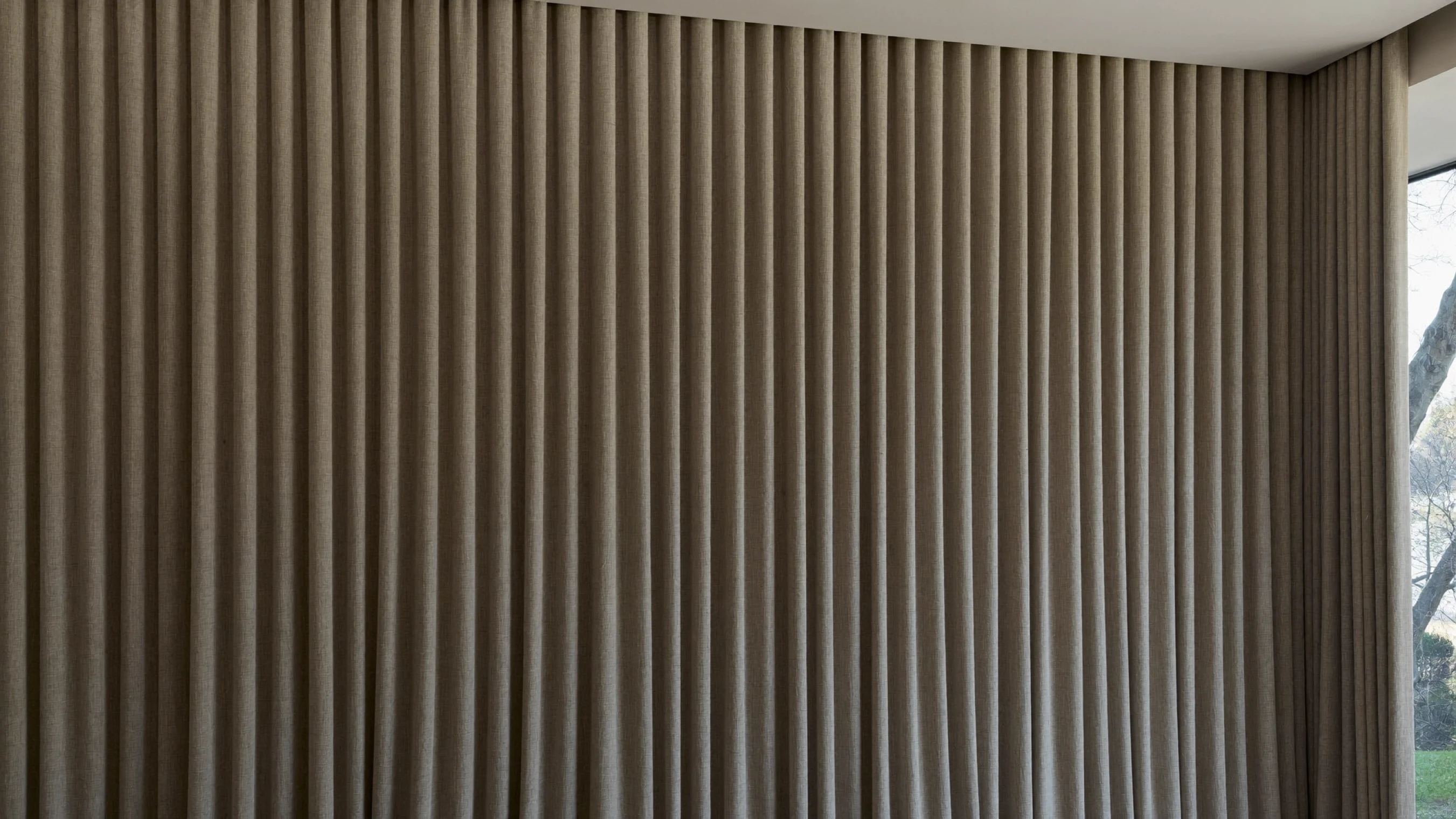 2.5–3.0+: насыщенная, тактильная среда. Оправдано в спальнях и парадных гостиных, где текстиль выступает как самостоятельный архитектурный слой, создающий уют и акустический комфорт. Ткани: натуральный шёлк, тафта, все виды тюлей (вуаль, сетка, органза). Для тюля и тонкого шёлка высокий коэффициент — это вопрос не только красоты, но и приватности: чем больше слоёв ткани накладывается друг на друга в складке, тем меньше просматривается интерьер с улицы.