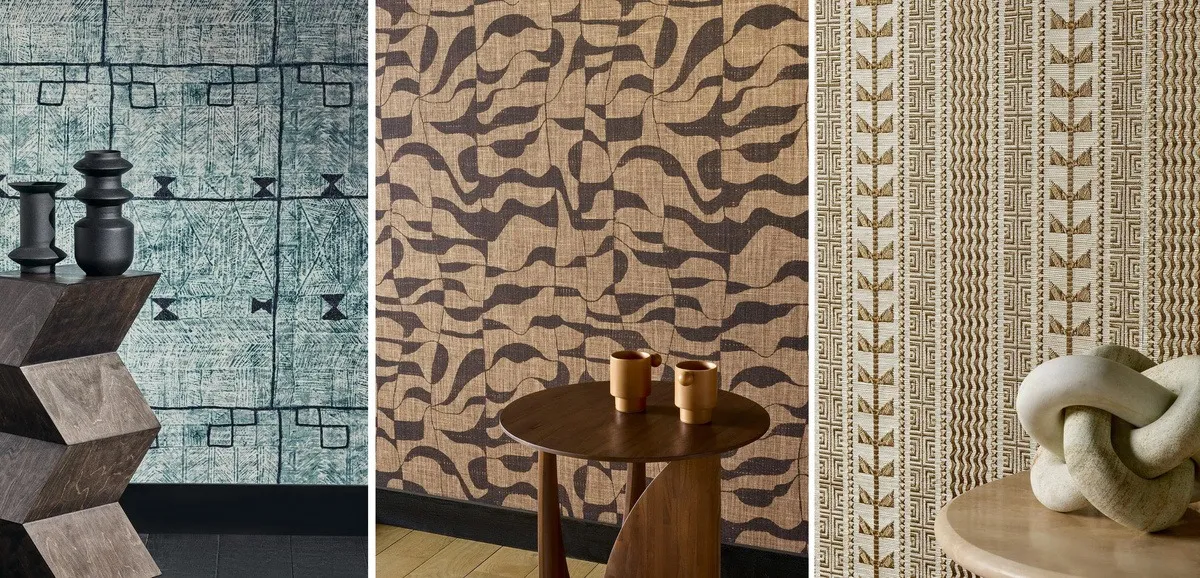 Полотна Deserts работают на границе рисунка и фактуры. Pierre Frey часто использует приём, когда обои становятся частью материальной среды. Здесь этот эффект достигается мягкой графикой — крупными линиями, абстрактными структурами, которые напоминают ландшафтные формы: дюны, волны, плоскости, размытые границы света и даже фигуры людей.