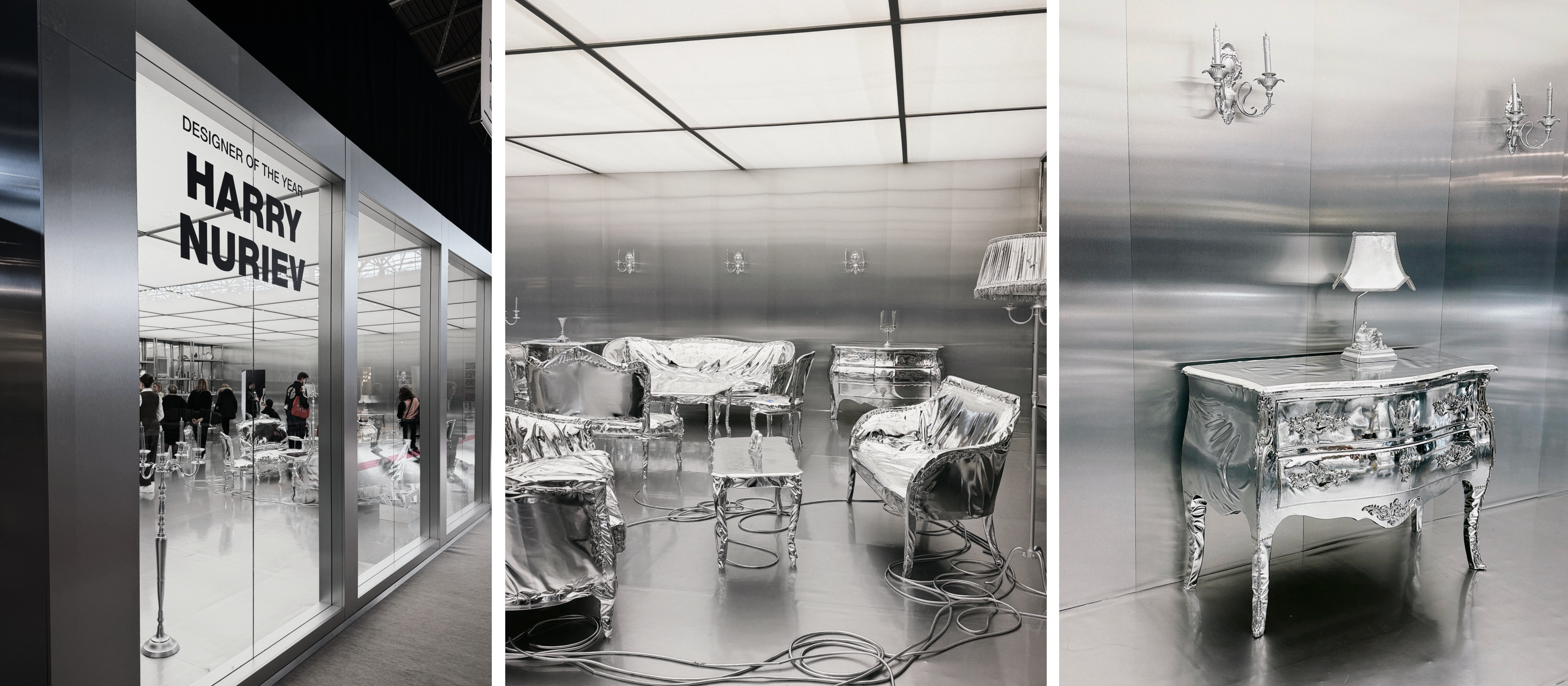 Концепция и визуал: Нуриев создал пространство, напоминающее стерильную лабораторию или футуристический бункер. В центре внимания — классическая, даже помпезная мебель, которая была полностью «одета» в серебряную металлизированную ткань или покрыта слоем серебра. Наряду с ней на стеллажах можно заметить и объекты из эпохи 90-х, и даже современные бытовые артефакты — принтер, пылесос и даже пульверизатор.