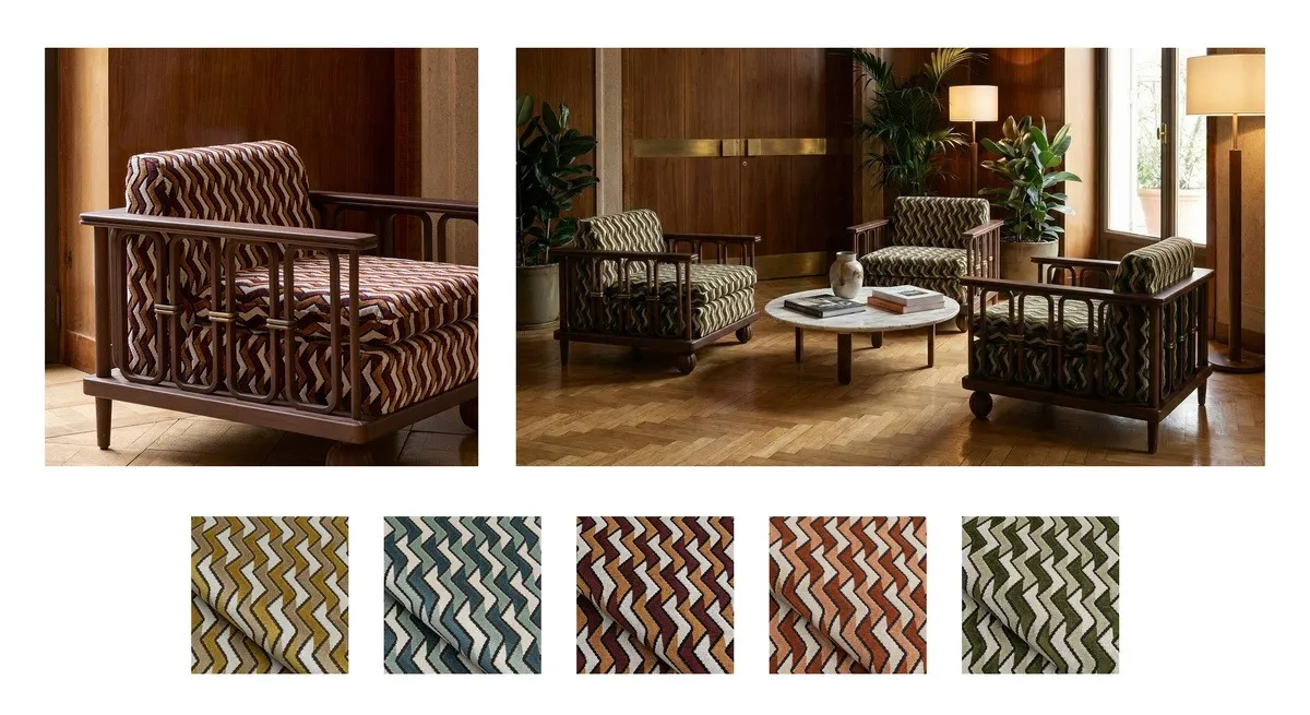 Branzi — безусловно акцентный обивочный материал. Он будет великолепно смотреться на креслах, банкетках или в качестве обивки изголовья кровати, задавая ритм гостиной или спальни. Его цветовая и фактурная смелость определённо требует лаконичного окружения в интерьере.