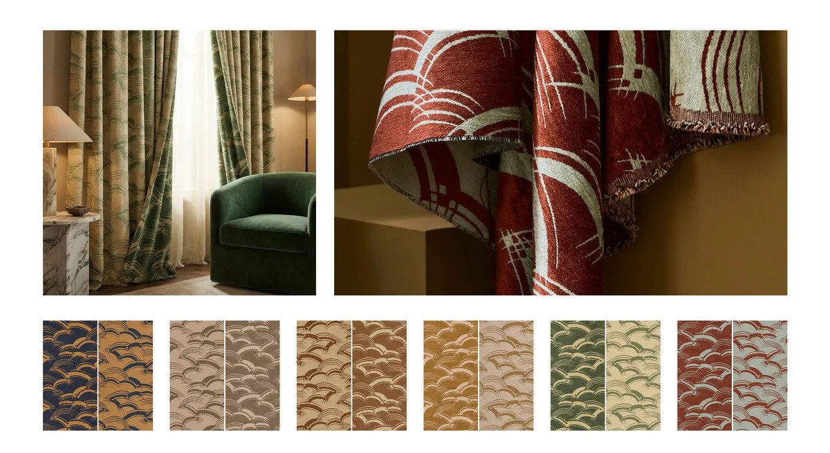 Ike — самая плавная и «текучая» ткань коллекции. Здесь строгая геометрия уступает место мягко пересекающимся дугам и аркам. Паттерн напоминает стилизованные морские волны или потоки воздуха. Nobilis описывает это как «хореографическую структуру» — рисунок находится в постоянном движении, балансируя между напряжением и лёгкостью.