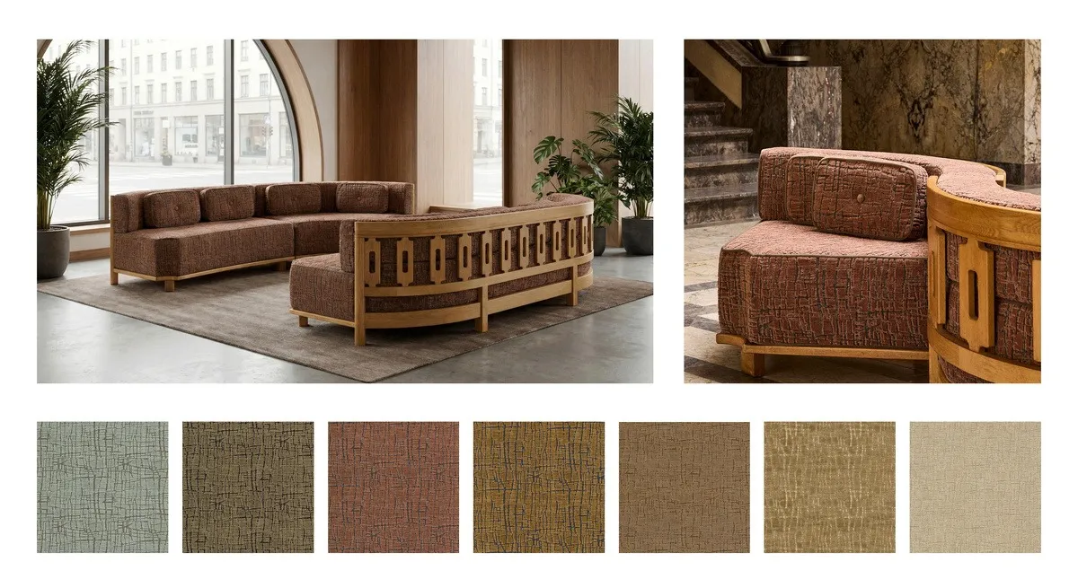 Концептуальное ядро коллекции — игра с геометрией и рельефом. Дизайнеры Nobilis обратились к языку абстракции: здесь линии, дуги и сегменты складываются в структуры, напоминающие то природную минеральность, то стилизованную письменность, то смелую геометрию. Представлены бархаты нового поколения — тяжёлые, скульптурные, способные поддерживать форму мебели и менять свой характер в зависимости от освещения.
