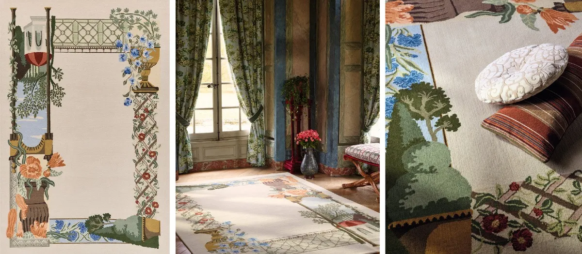 Здесь повторяется та же логика, что из тканями: много растительных мотивов соседствует с геометрическими элементами и смелыми панно с архитектурными элементами, изображающими центральную перспективу регулярного парка. Крупнораппортные обои открывают ту эпоху с особой монументальностью и роскошью. Здесь же появляются и гобелены XVII и XVIII веков, и вдохновение классикой Toile de Jouy, и искусно вышитые полотна из соломы и сизаля, и даже чертежи оранжерей.