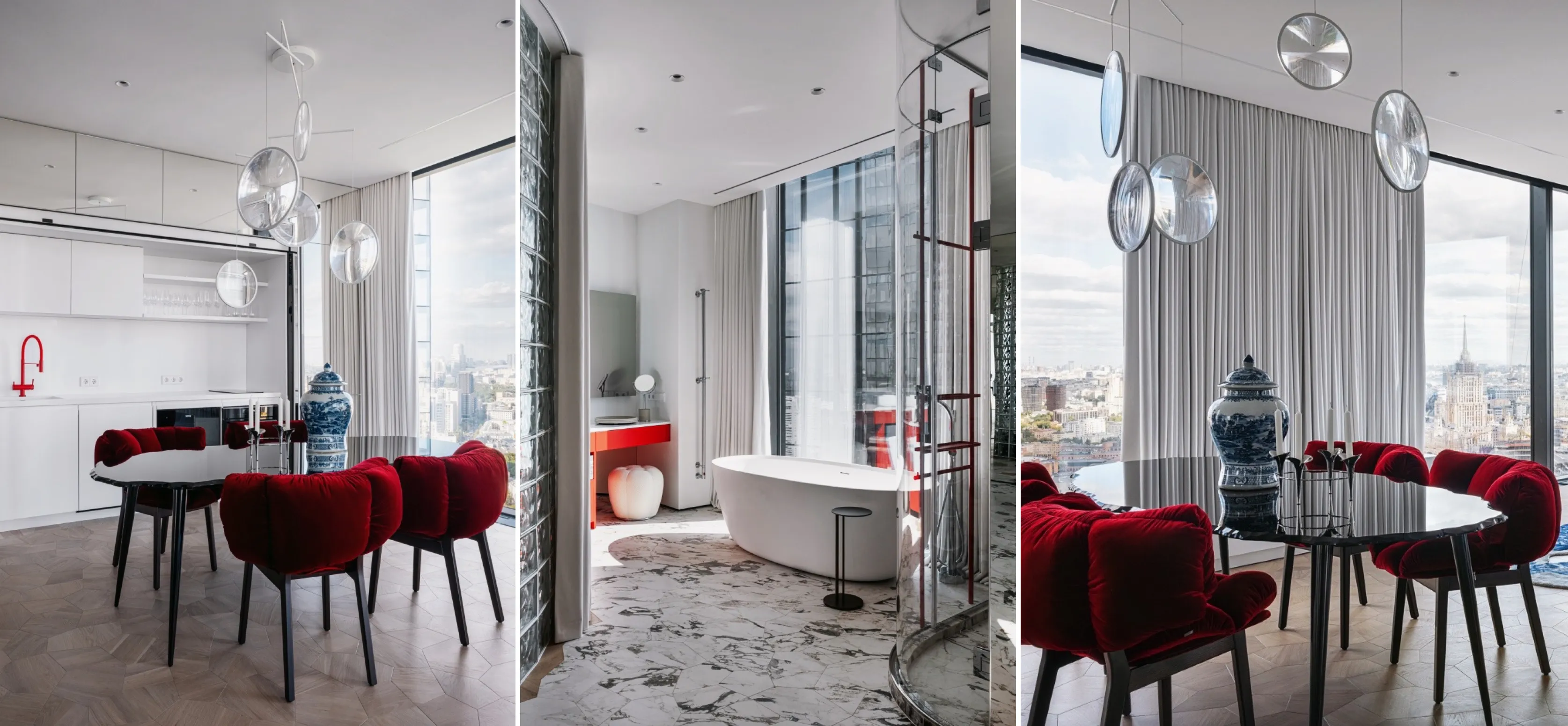 Особенностью планировки стало открытое пространство без углов и привычного чёткого зонирования. Исключение составляет радиусная перегородка из стеклоблоков вокруг зоны спальни, обеспечивающая приватность, но не нарушающая общего ощущения целостности пространства. В квартире много света благодаря высоким панорамным окнам, дополнительно ощущение простора добавляет наличие зеркал и минимальные физические границы между зонами. Использование зеркал усилено: они умножают свет, отражают панораму города и включаются в композицию как равноправные элементы.