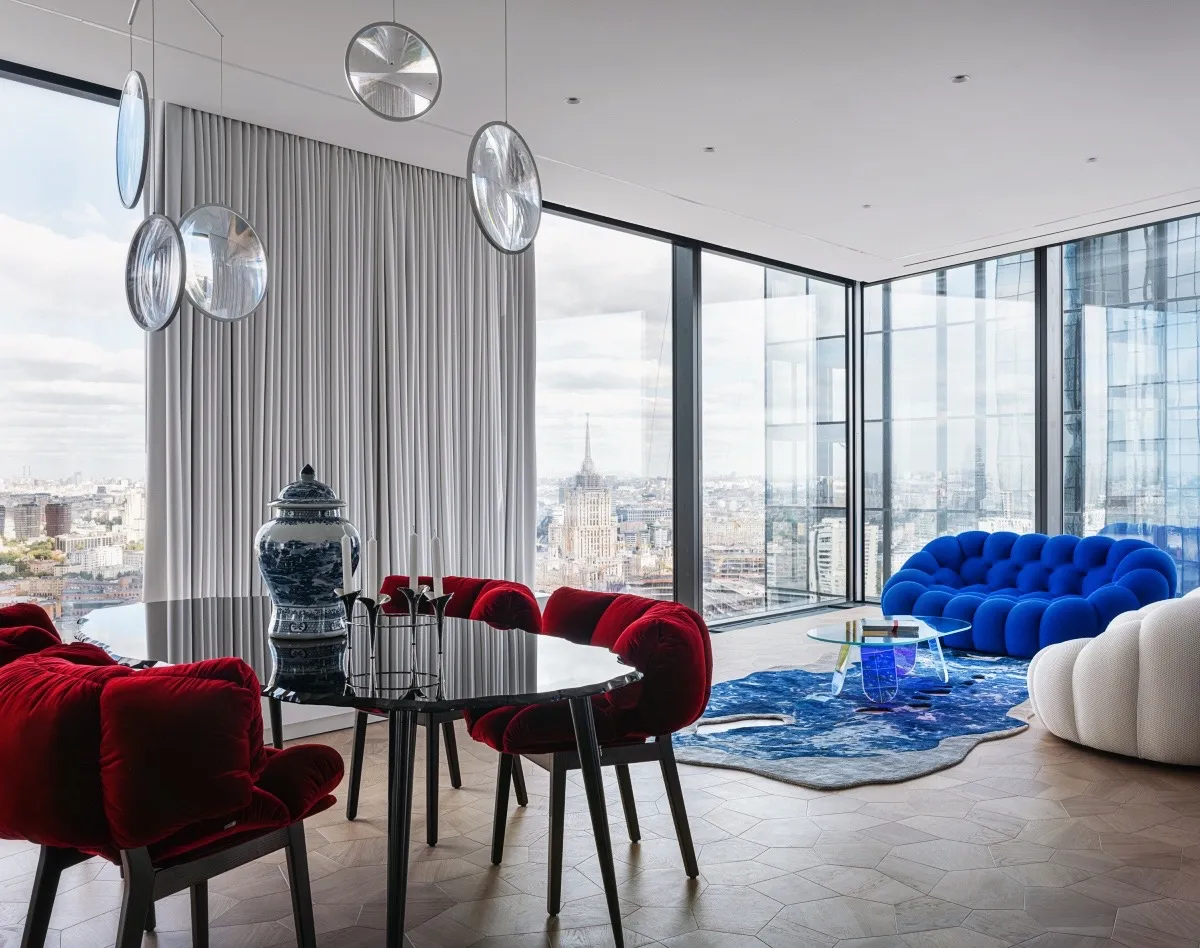 Интерьер квартиры певицы Славы в Capital Towers демонстрирует смелый отказ от привычных схем и утверждает эстетику, построенную на свободе форм, насыщенной палитре и продуманной эклектике. Дизайнер Ирина Чернейкина создала пространство, в котором каждый элемент — от панорамных перспектив до бархатных драпировок — работает на драматургию интерьера, а открытая планировка становится его главным выразительным инструментом.
