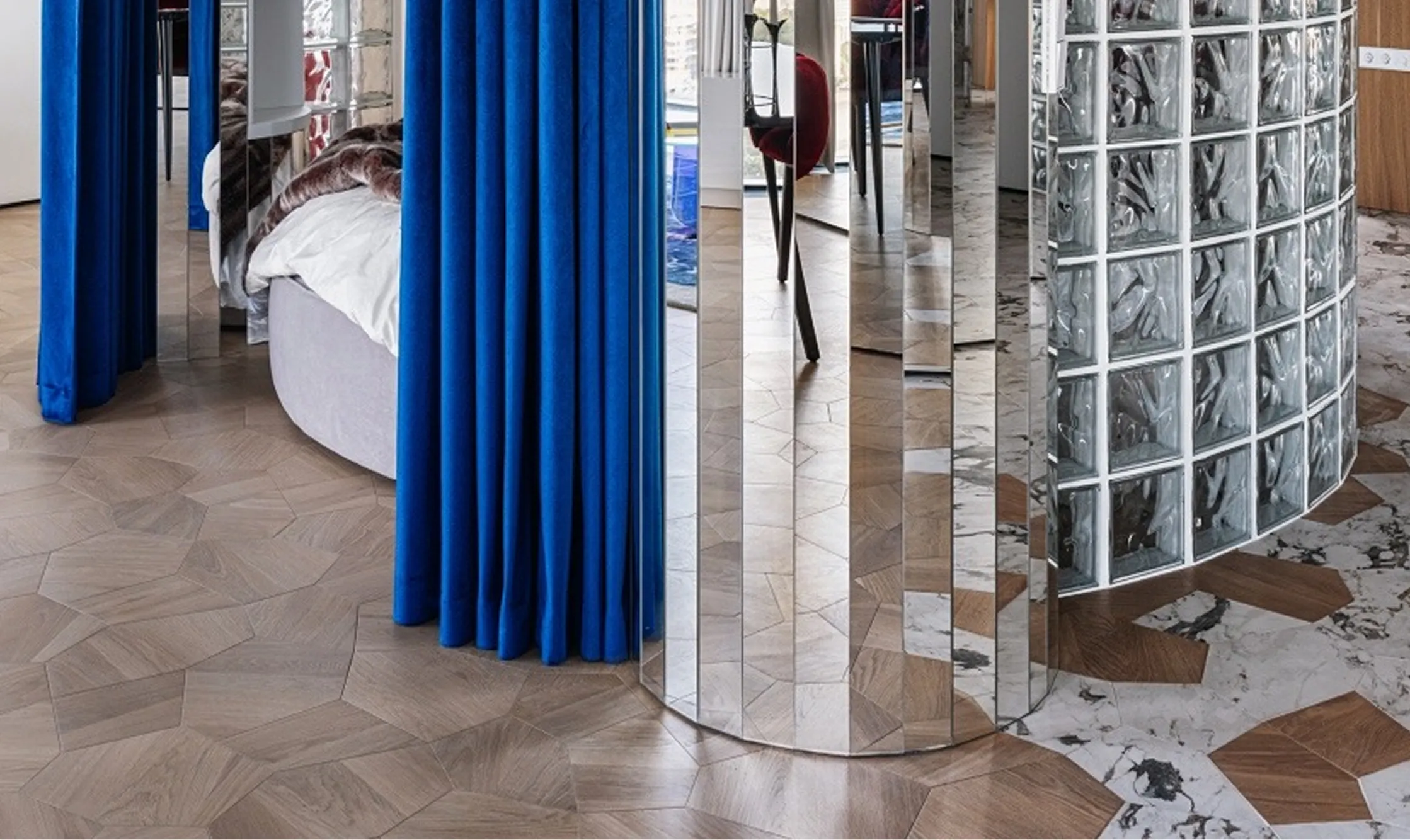 Бархатная драпировка в спальной зоне выполняет не только эстетическую, но и функциональную роль: она становится элементом приватности внутри открытой планировки. Спальня вбирает в себя и ванную, визуально отделённую тонкими переходами напольной отделки — от паркета к керамограниту, уложенному как декоративный ковёр.